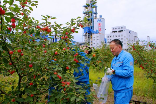 沙果——我國特有的一種水果,每年8-9月成熟。走進宏基水泥的辦公區,就能看到一片片的沙果林,紅紅的果實壓彎樹枝,飄散著濃郁的果香。果實成熟后,大家紛紛提著袋子來到果園采摘,歡笑聲、加油聲、吶喊聲此起彼伏,處處呈現熱鬧、喜悅的豐收景象。
