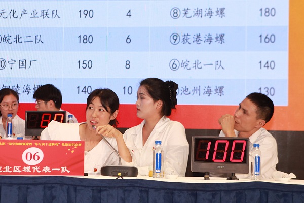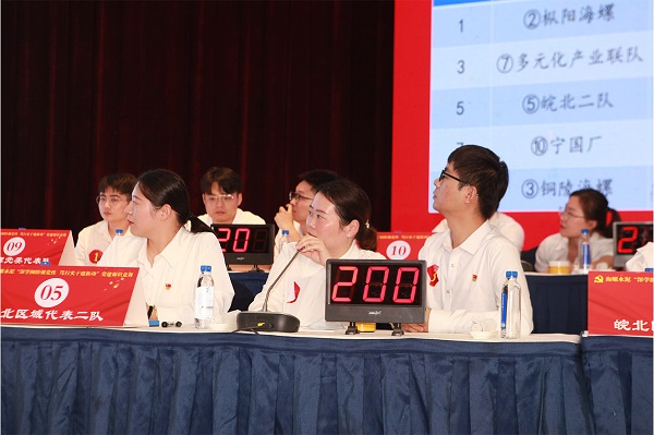 競賽來到第二階段同題共答環節,6支晉級的代表隊全部清零,迎來了新一輪的“大考”。經過13道題目的比拼,寧國廠代表隊率先取得晉級下一輪的“入場券”;樅陽海螺代表隊和省內多元化產業聯隊因得分相同,在經過一輪的加賽后,省內多元化產業聯隊搶得先機,成功晉級。