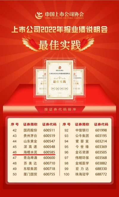 近日,中國上市公司協會發布“2022年報業績說明會最佳及優秀實踐”評選結果,海螺水泥榮獲“上市公司2022年報業績說明會最佳實踐”獎。