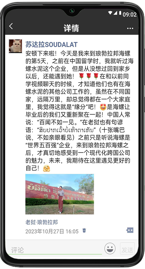 2023年是共建“一帶一路”倡議提出十周年,十年來,海螺水泥堅(jiān)持人才“本地化”培養(yǎng),現(xiàn)在,海螺的大家庭里已有3000多名外籍員工,他們見證了一座座海螺工廠的拔地而起,還親身經(jīng)歷了海螺發(fā)展帶來的變化,在海螺收獲了成長(zhǎng)和友誼。現(xiàn)在,就讓我們打開“朋友圈”,一起來看看他們的分享吧!