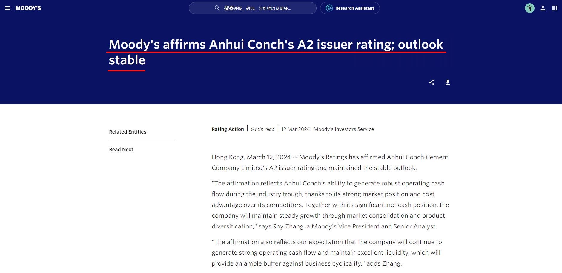 3月12日,國際金融評級機構穆迪(Moody’s Ratings)宣布保持安徽海螺水泥股份有限公司A2發行人評級,評級展望維持“穩定”。據了解這也是全球建材行業最高評級,而海螺水泥已連續七年獲此評級。