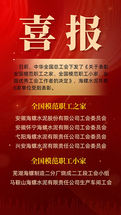 日前,中華全國(guó)總工會(huì)下發(fā)了《關(guān)于表彰全國(guó)模范職工之家、全國(guó)模范職工小家、全國(guó)優(yōu)秀工會(huì)工作者的決定》,海螺水泥共有6家單位獲得表彰。其中,安徽海螺水泥股份有限公司工會(huì)委員會(huì)、安徽懷寧海螺水泥有限公司工會(huì)委員會(huì)、弋陽(yáng)海螺水泥有限責(zé)任公司工會(huì)委員會(huì)、興安海螺水泥有限責(zé)任公司工會(huì)委員會(huì)獲評(píng)“全國(guó)模范職工之家”,蕪湖海螺水泥有限公司制造二分廠燒成二工段工會(huì)小組、馬鞍山海螺水泥有限責(zé)任公司生產(chǎn)車(chē)間工會(huì)獲評(píng)“全國(guó)模范職工小家”。