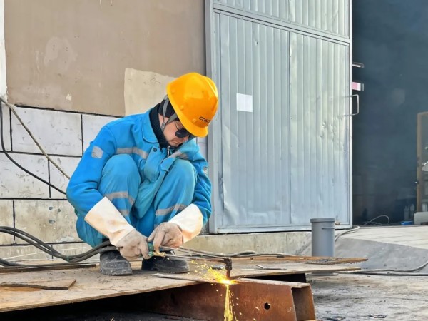 卡爾希海螺維修工貝克正在進行鋼材下料作業,他說:“Payvandchi qo‘lidagi yong‘in – uskunaning barqaror ishlashining kafolati.(用我手中的焊槍,保障設備穩定運行)”