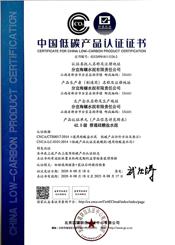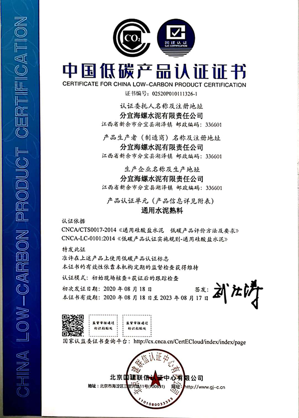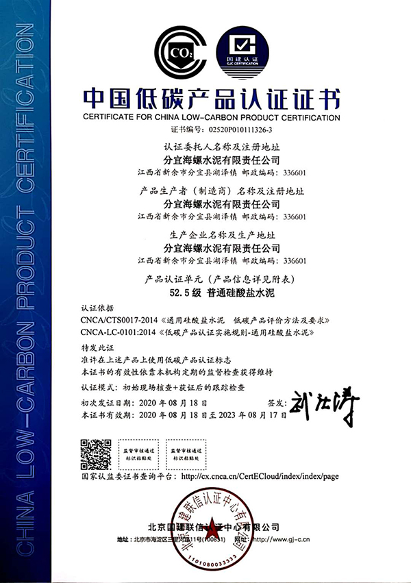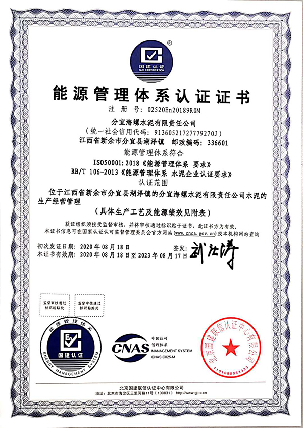近期,分宜海螺水泥有限責任公司生產的水泥產品(包含通用水泥熟料、普通硅酸鹽水泥P.O42.5、普通硅酸鹽水泥P.O52.5)順利通過國家低碳產品認證審核,獲得《低碳產品認證證書》,成為新余首家取得低碳產品認證證書的企業。同時獲得《能源管理體系認證證書》。