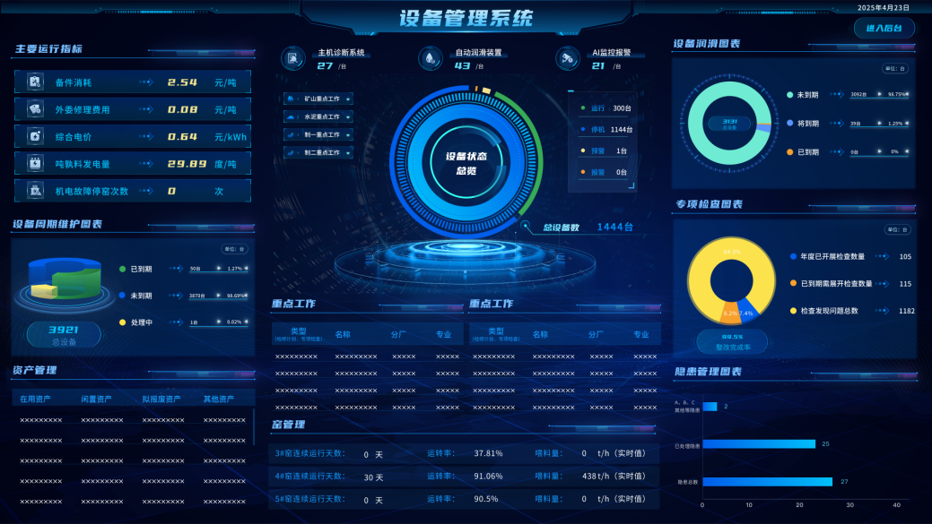 2023年8月,荻港海螺開始引入設(shè)備管理系統(tǒng),2023年11月開始投入使用,截止目前全套系統(tǒng)已完成主機在線診斷、皮帶機AI監(jiān)測、智能潤滑、現(xiàn)場視頻監(jiān)控以及DCS系統(tǒng)數(shù)據(jù)融合,實現(xiàn)了生產(chǎn)線管理“設(shè)備巡檢智能化,維護維修一體化”。
