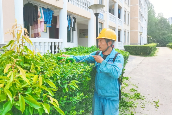 辦公室后勤綠化工黃斗忠正在后勤區域對綠植進行修剪,讓綠植既保持自然生機又呈現幾何美感,試圖將工業廠區變成園林式生態空間。(楊玲/攝)