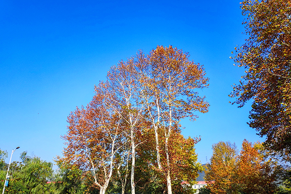 湛藍天空下,樹木枝葉浸染斑斕秋色,于工業景致中勾勒出一抹自然暈染的生機畫卷。