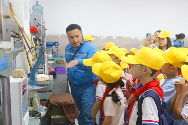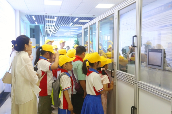 泛滿藍色燈光的中控室內,科技感拉滿,孩子們被眼前景象所震撼,數十塊電子屏閃爍著數據和圖表,仿佛是工業“大腦”;遍布精密儀器設備的實驗室內,孩子們圍觀著機械臂精準抓取樣品的操作,仿佛置身魔術表演空間,“這機械手臂可以幫我批改作業嗎?”突然一句天真無邪的話讓整個場景變得趣味橫生!