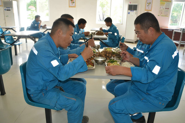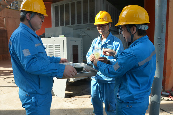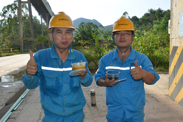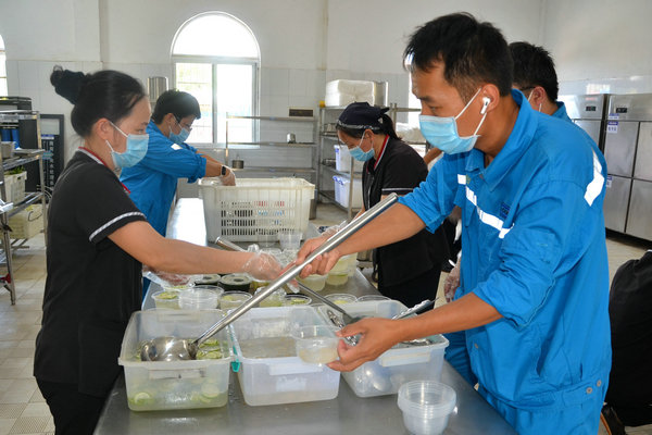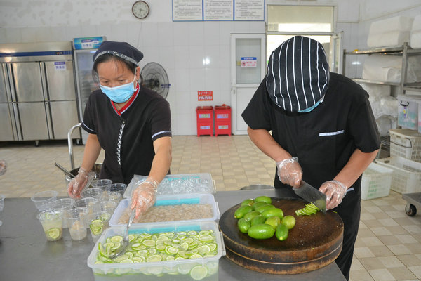 采摘下來的新鮮龍眼和檸檬很快被送往食堂,食堂師傅們忙碌起來,將飽滿多汁的龍眼剝殼取肉,檸檬切片榨汁,熬制當地特產涼粉草。龍眼果肉與檸檬片在清冽礦泉水中舒展,釋放出清甜與微酸的完美協奏;涼粉草熬制的“北流涼粉”,凝凍如墨玉,清涼解暑。天然原料經巧手化作兩大消暑佳品——晶瑩剔透的龍眼檸檬水與地道爽滑的“北流涼粉”。冰鎮后的飲品帶著果香與涼意,被后勤人員分裝成杯,及時送到各崗位。