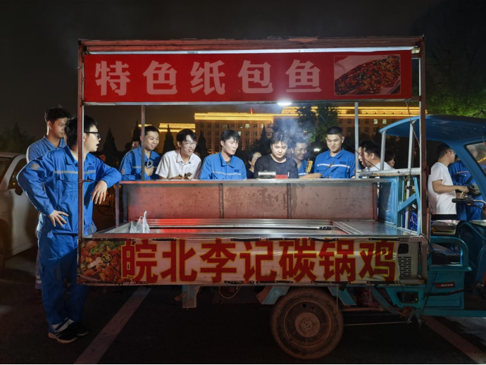 現場互動中,協作的暖意更濃。外燴團隊忙得熱火朝天時,員工們自發組成“志愿小分隊”,有的幫忙傳遞食材,有的協助維持取餐秩序,還不忘和外燴師傅交流烤串技巧。“你們烤串講究火候,我們生產水泥講究配比,都是‘技術活’!”一位老員工的玩笑話,讓外燴師傅與在場員工都笑了起來。新老員工圍在取餐區,主動為彼此遞餐、分享美食,你幫我拿烤翅,我替你取飲料,簡單的互動里,滿是團隊成員間的默契與溫情。